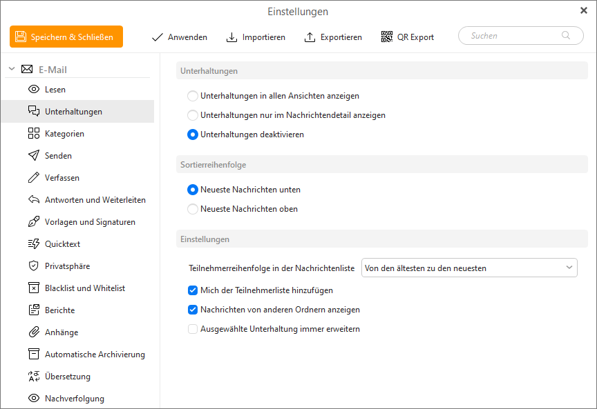 Die Unterhalutngsansicht wurde um einige praktische Verbesserungen erweitert: Sie haben nun die Möglichkeit, Nachrichten aus anderen Ordnern anzuzeigen oder bestimmte Unterhaltungen immer automatisch zu erweitern. Entfernen Sie Ihren eigenen Namen, um einen besseren Überblick über die anderen Absender und Empfänger zu behalten, oder passen Sie die Reihenfolge der Namen in der Nachrichtenliste an. Alle Optionen finden Sie unter Einstellungen > E-Mail > Unterhaltungen.