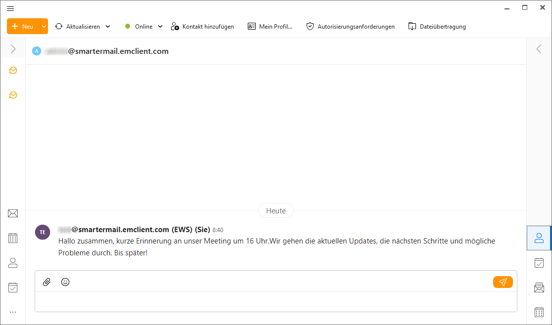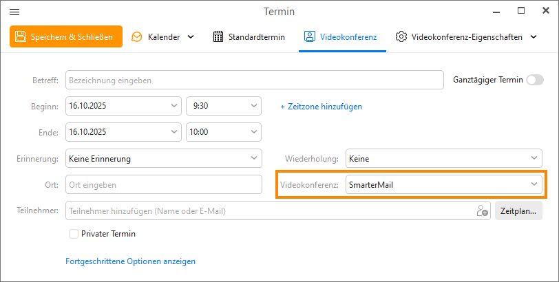 Die eM Client-App bietet native Unterstützung für SmarterMail Online-Meetings. Das bedeutet, dass Sie ein Online-Meeting ganz einfach erstellen und SmarterMail als Anbieter auswählen können: eM Client legt das SmarterMail-Meeting automatisch an und fügt den Meeting-Link direkt in den Termin ein. Ein Wechsel zur SmarterMail-Weboberfläche ist nicht nötig.
