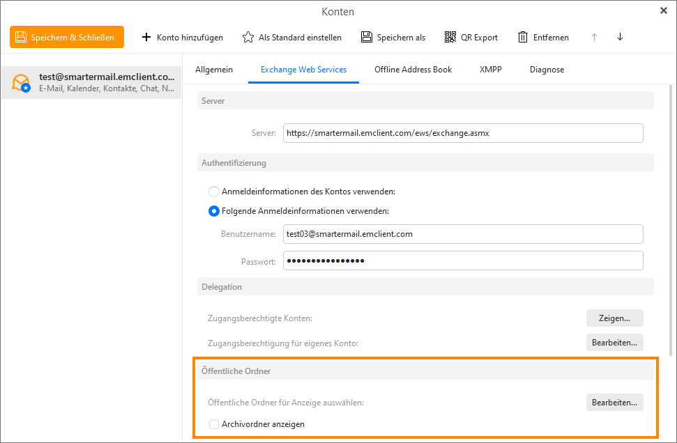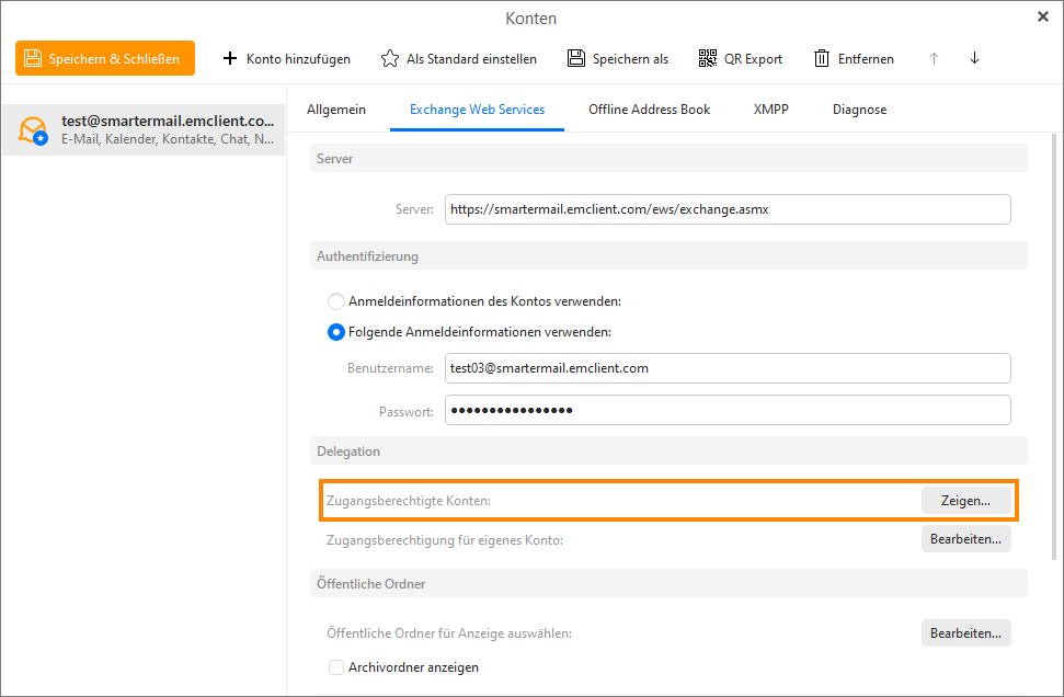 Gehen Sie zu Menü > Konten (Windows) oder eM Client > Konten (macOS) und wählen Sie Ihr SmarterMail-Konto aus. Die Delegation finden Sie unter dem Tab Exchange Web Services.