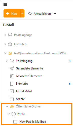 Die von Ihnen abonnierten öffentlichen Ordner werden im linken Bereich unter dem delegierten Konto angezeigt.