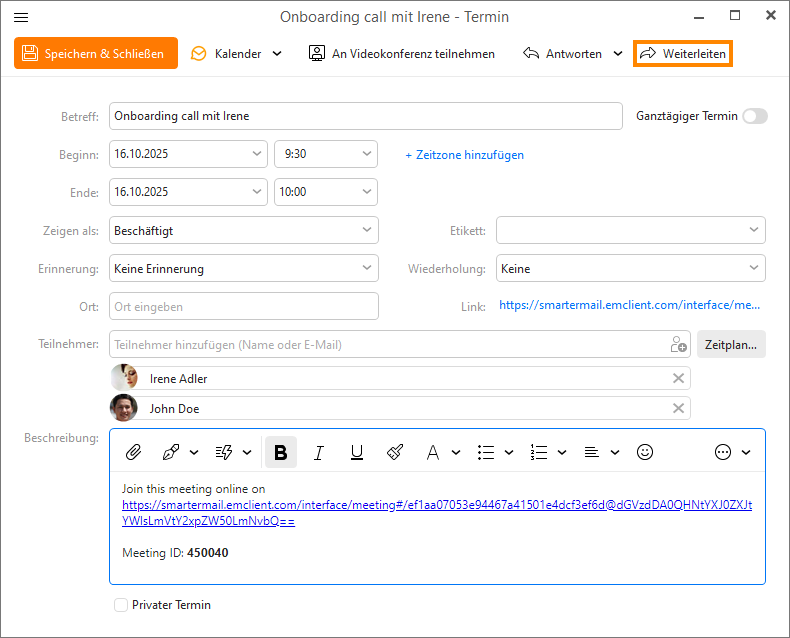Einladungen lassen sich zudem weiterleiten, sodass weitere Teilnehmer dem Meeting beitreten können, ohne dass der Organisator sie manuell hinzufügen muss: