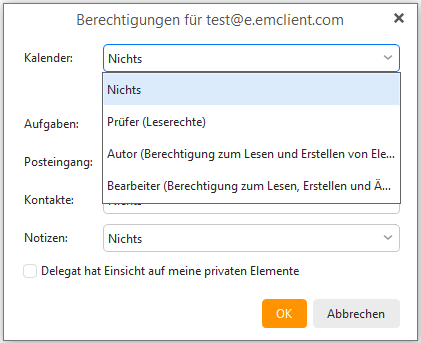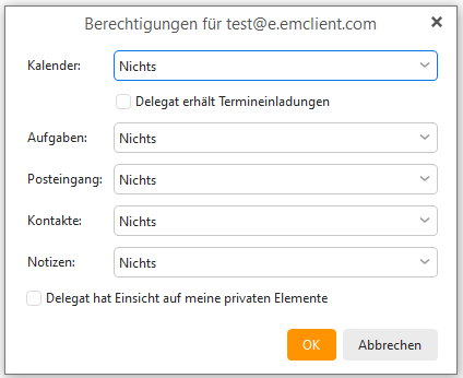 Sobald Sie auf „OK” klicken, haben Sie die Möglichkeit, die Berechtigungseinstellungen anzupassen. Sie können dem delegierten Konto eingeschränkten Zugriff gewähren, indem Sie das Lesen, Erstellen oder Ändern von Elementen oder eine beliebige Kombination dieser Optionen zulassen: