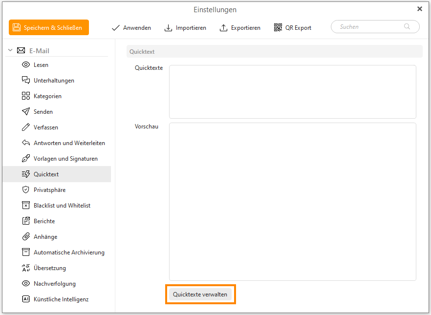 Klicken Sie anschließend auf die Schaltfläche QuickTexte verwalten, um den QuickText-Manager zu öffnen: