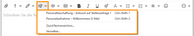 Beim Verfassen einer neuen Nachricht können Sie QuickTexte über die Schaltfläche QuickText in der Symbolleiste des Nachrichtenfensters einfügen: