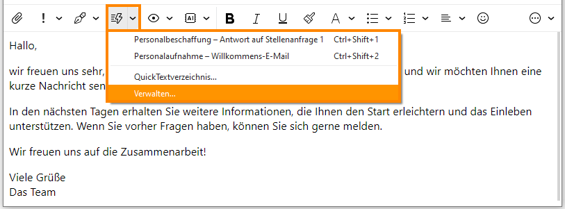 Wählen Sie einfach den gewünschten QuickText aus dem Dropdown-Menü aus und klicken Sie darauf.