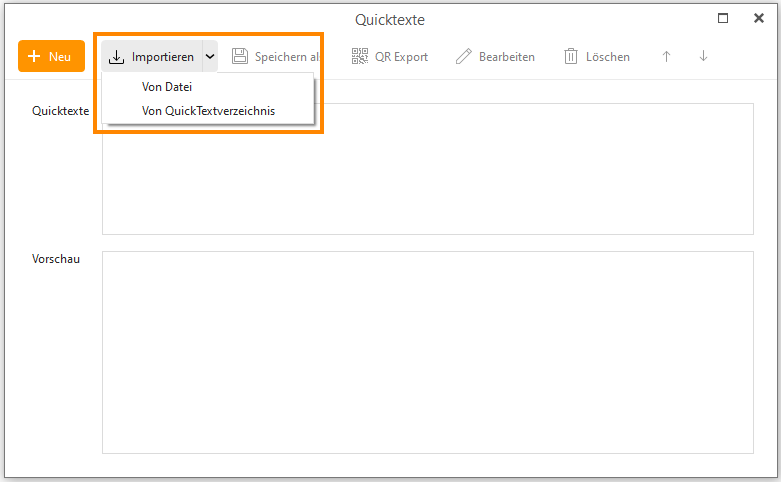 Beim Importieren aus einer Datei können Sie beispielsweise QuickTexte wiederverwenden, die Sie auf einem anderen Gerät erstellt haben, oder vorformatierte QuickTexte importieren, die Ihnen ein Kollege zur Verfügung gestellt hat.