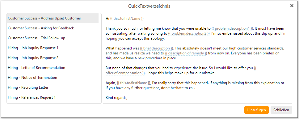 Das QuickTextverzeichnis bietet zusätzliche Inspiration, wenn Sie Unterstützung bei der Erstellung neuer QuickTexte benötigen. Sie können die dort verfügbaren Textbausteine entweder direkt verwenden oder an Ihre eigenen Bedürfnisse anpassen.