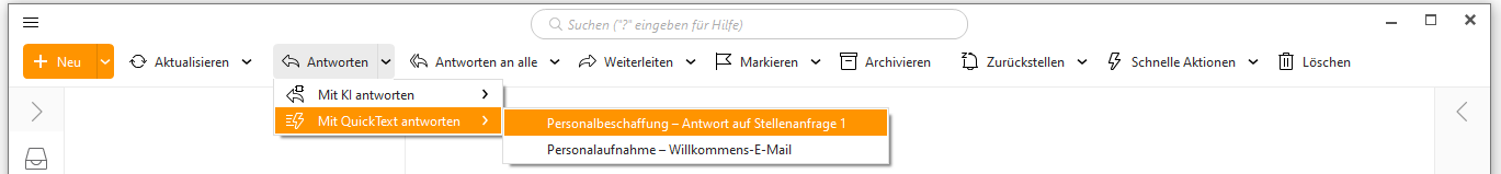 Die Funktion ist über das Dropdown-Menü der Antworten-Schaltfläche sowohl in der Symbolleiste des Hauptfensters als auch über die Schaltfläche „Antworten“ jeder Nachricht leicht zugänglich. Klicken Sie auf das Pfeilsymbol des Dropdown-Menüs und wählen Sie Mit QuickText antworten aus. Anschließend können Sie den gewünschten QuickText auswählen: