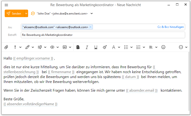 Vor dem Versenden der Nachricht können Sie die Platzhalter bei Bedarf durch individuelle Daten ersetzen.